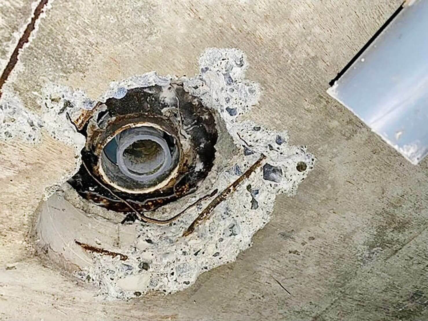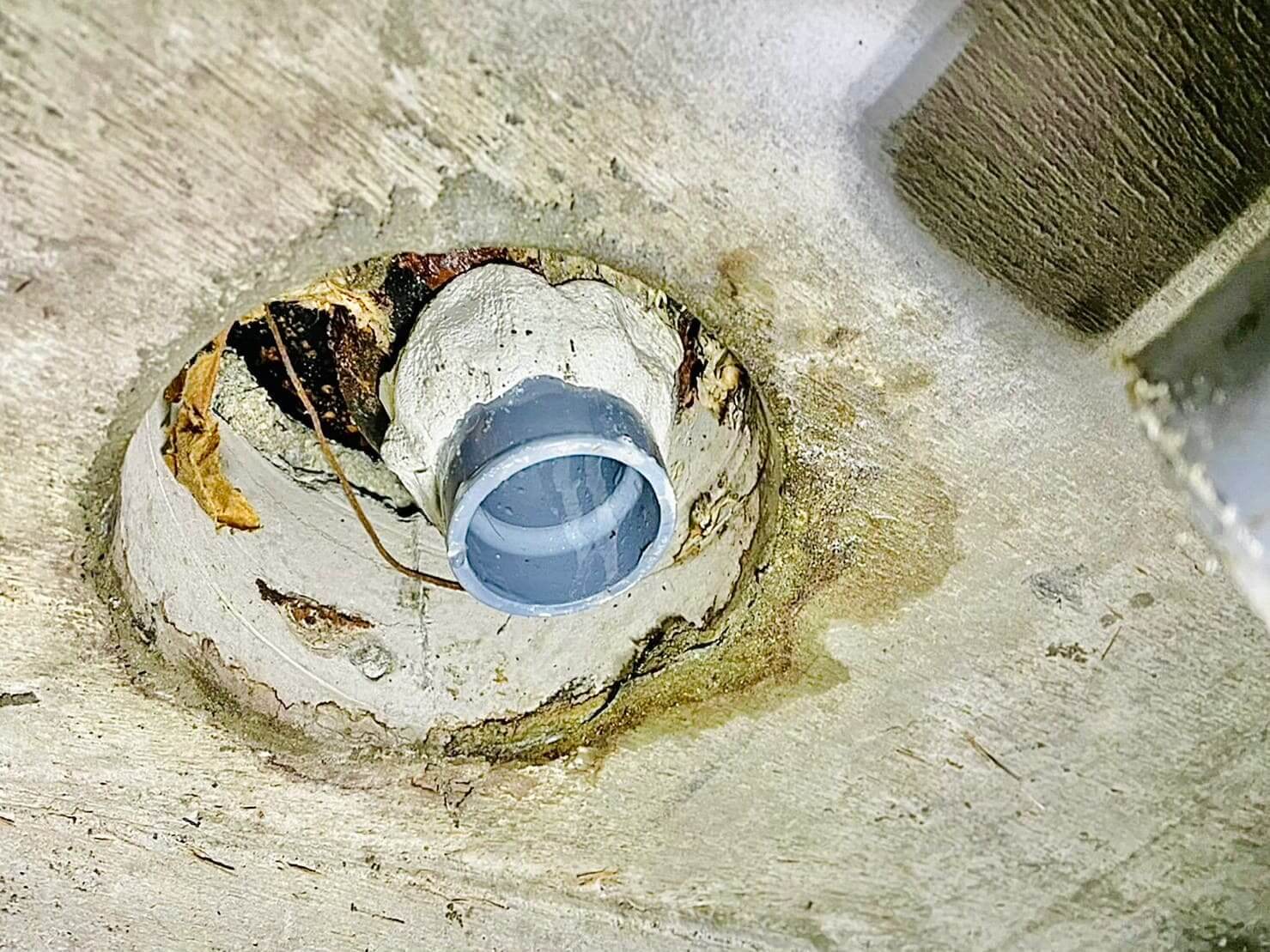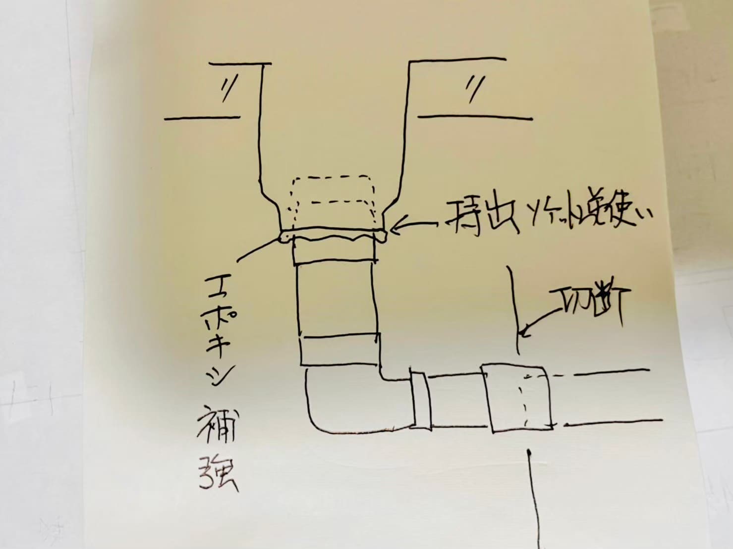 上階から塩ビ管同士で繋ぐ工事が必要になりますが、その前に一次対応として、内径持出ソケットを応急として逆向きで入れてエポキシパテで補強しました。