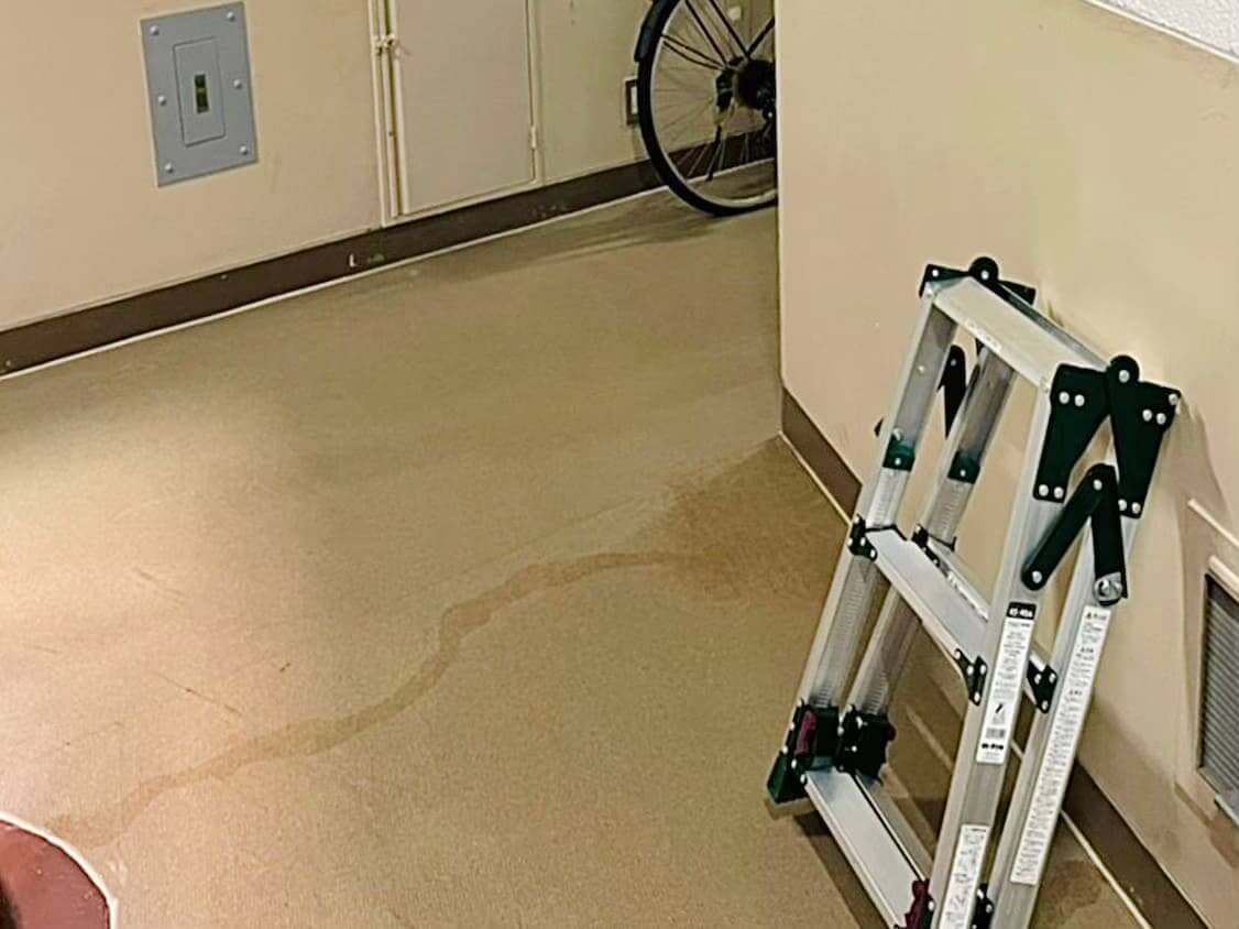 大量の落水で廊下の床も浸水被害を受けていました。