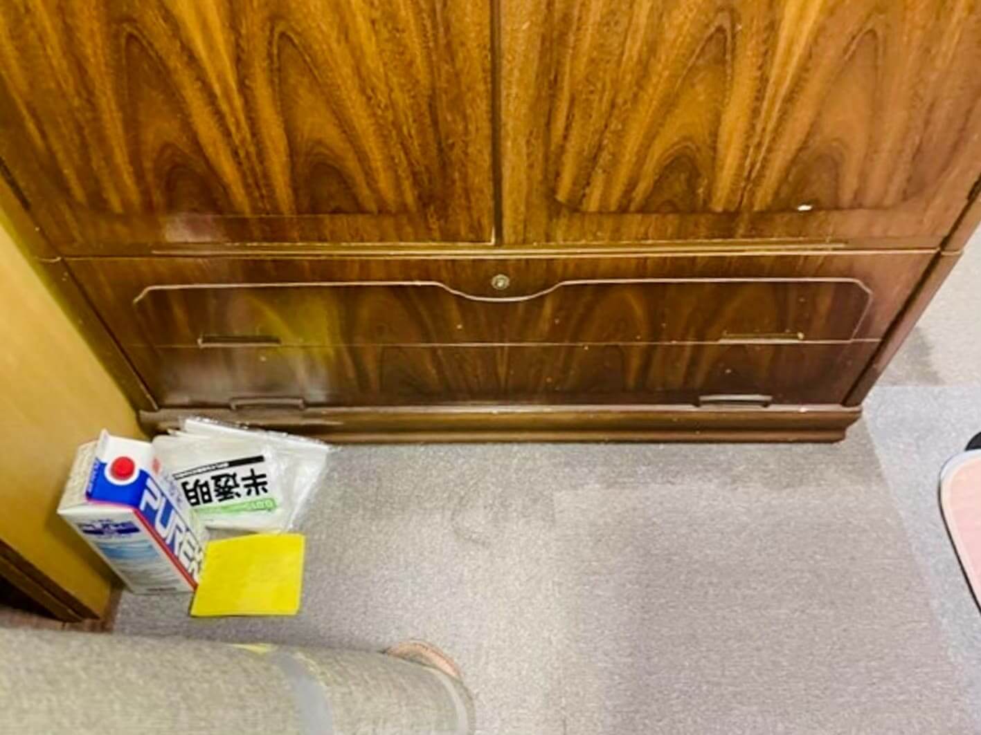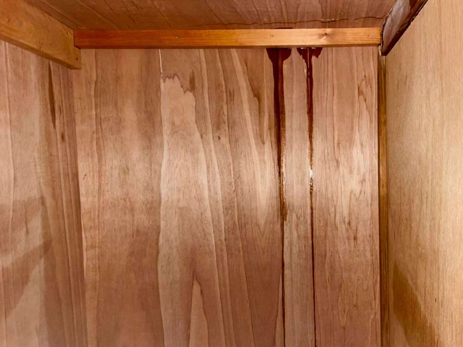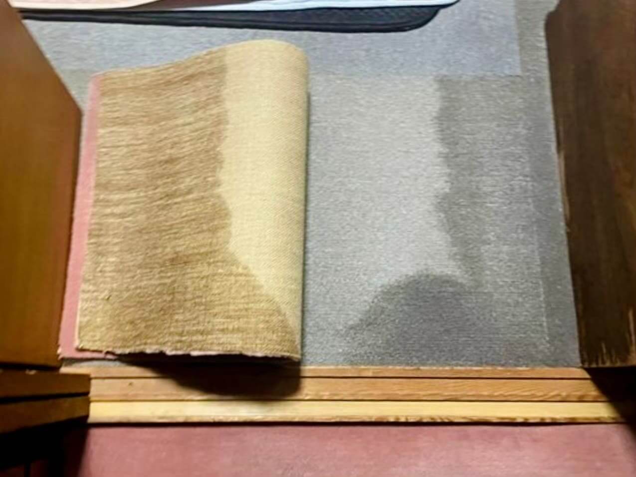 天井から壁に伝ってきた水が、家具下のカーペットに染み出ていて、押入の壁からも水が流れていました。