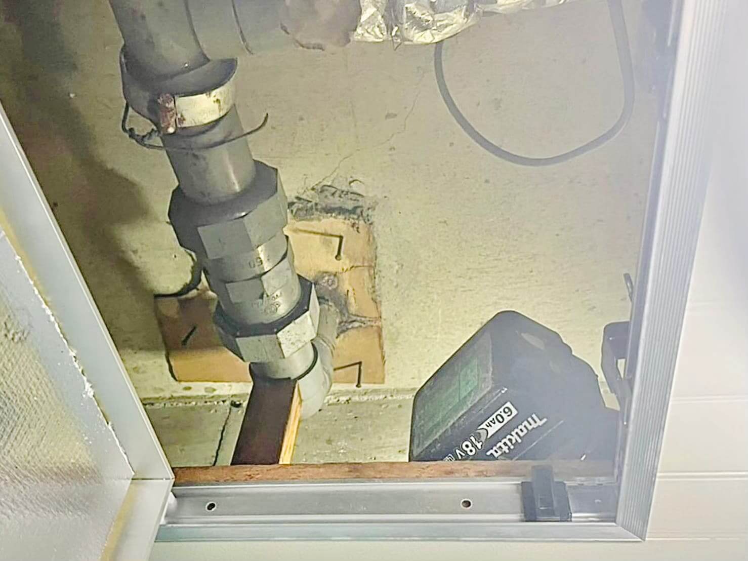 上階の浴室排水管と繋がっている天井配管の保温材を剝がすと、鋳物のトラップとVP管の継目が割れていました。