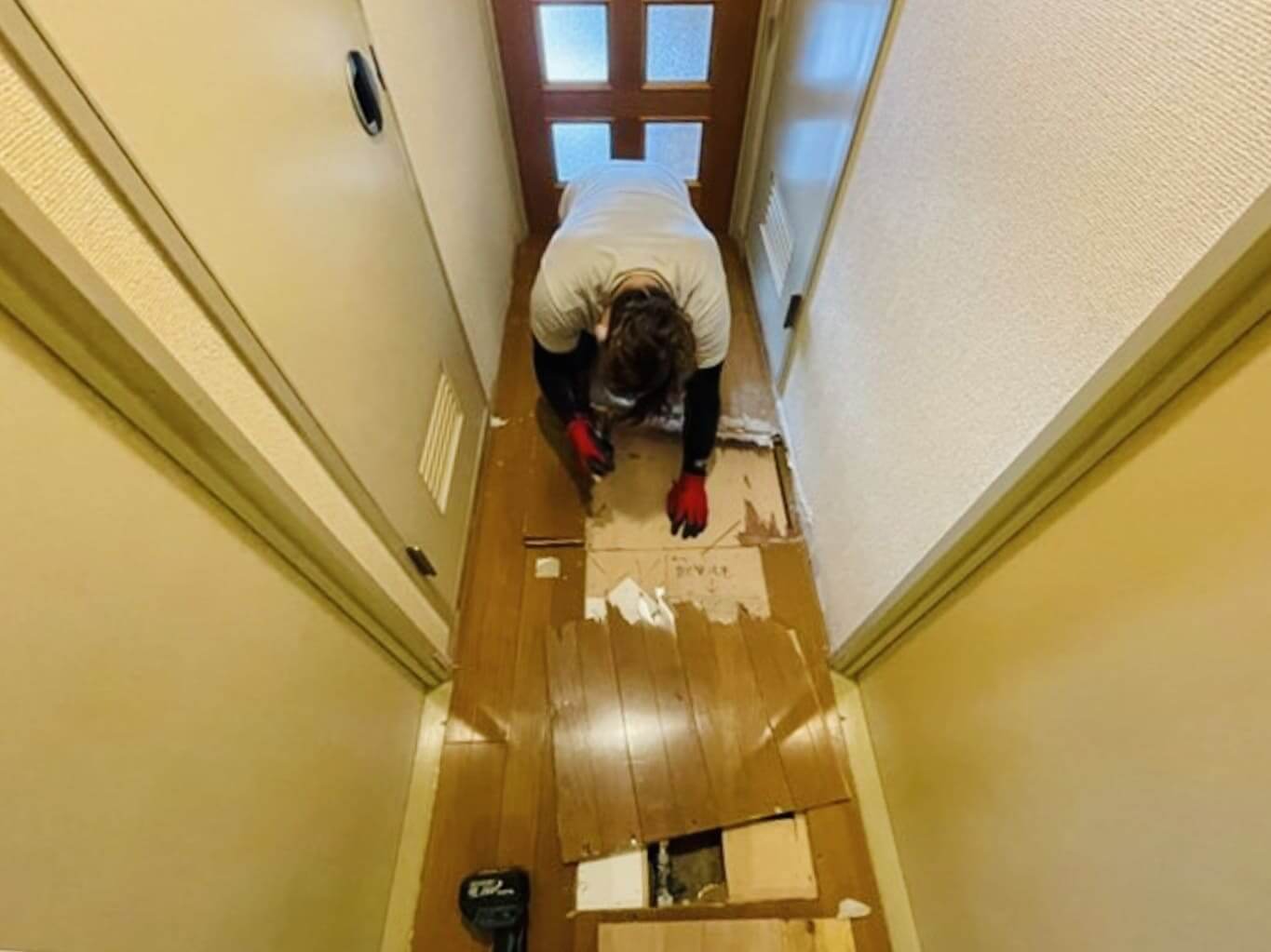 スコープカメラで確認した水濡れ付近の廊下の床を開口し、床下の水を排水ポンプで吸引してから、漏水箇所特定のための調査を始めました。