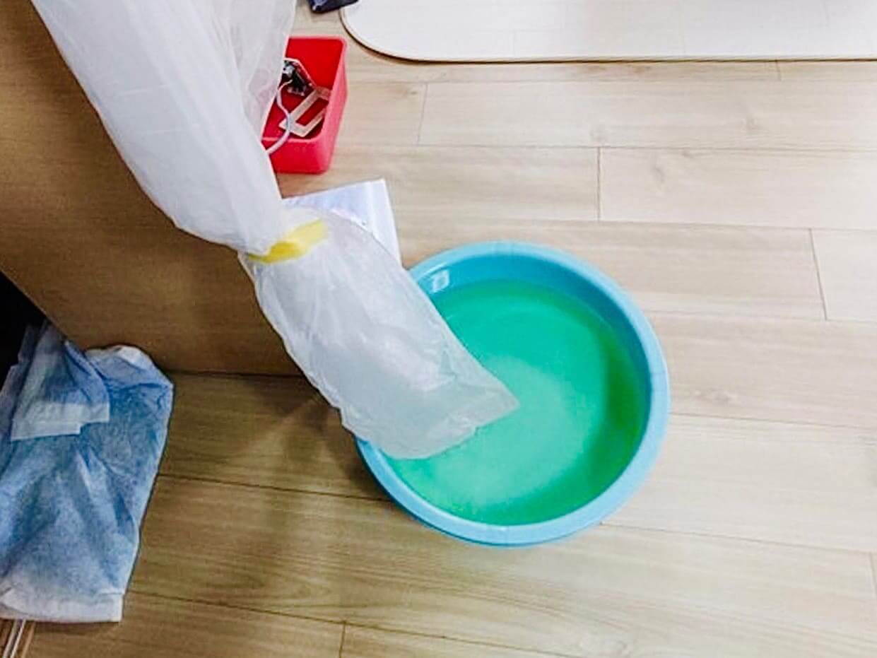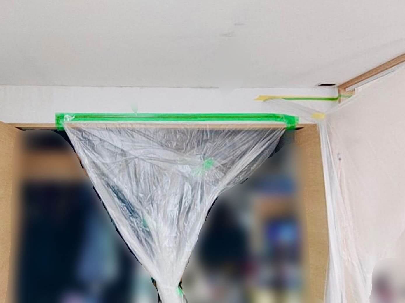 調査前の夜、管理組合が運営するマンションのサポートサービスから業者が来て、臨時対応として養生を施工し、上階宅の給水バルブを閉めたとのことでした。