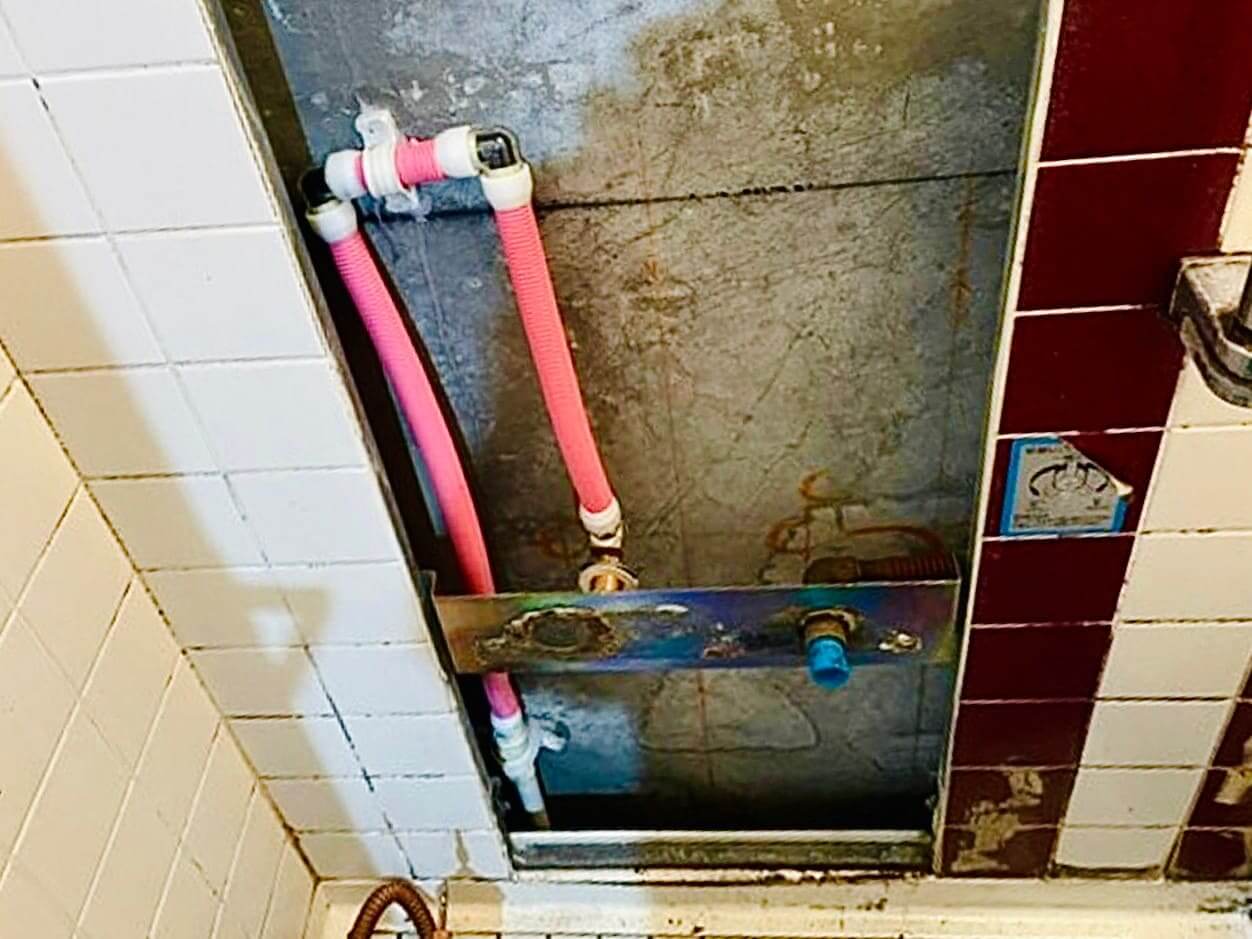 浴室水栓の吐水テストと給湯管の燃焼テストを行い、異常がないことを確認し、漏水配管の修繕工事を完了しました。