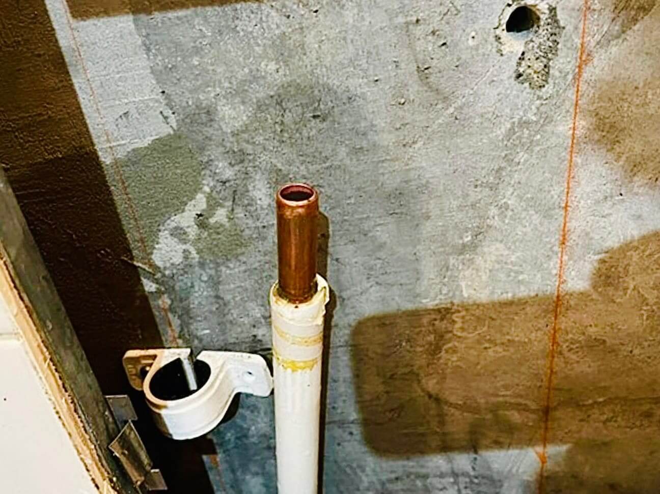 浴室の壁パネルを取り外すと、フレキシブル銅管の給湯配管に「ピンホール」と呼ばれる小さな穴が開いていて、そこから大量の水が吹き出していました。
