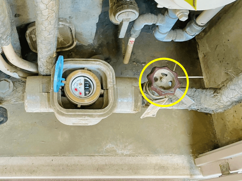 このバルブの取手を時計回りに回すことで水供給を停止できます。