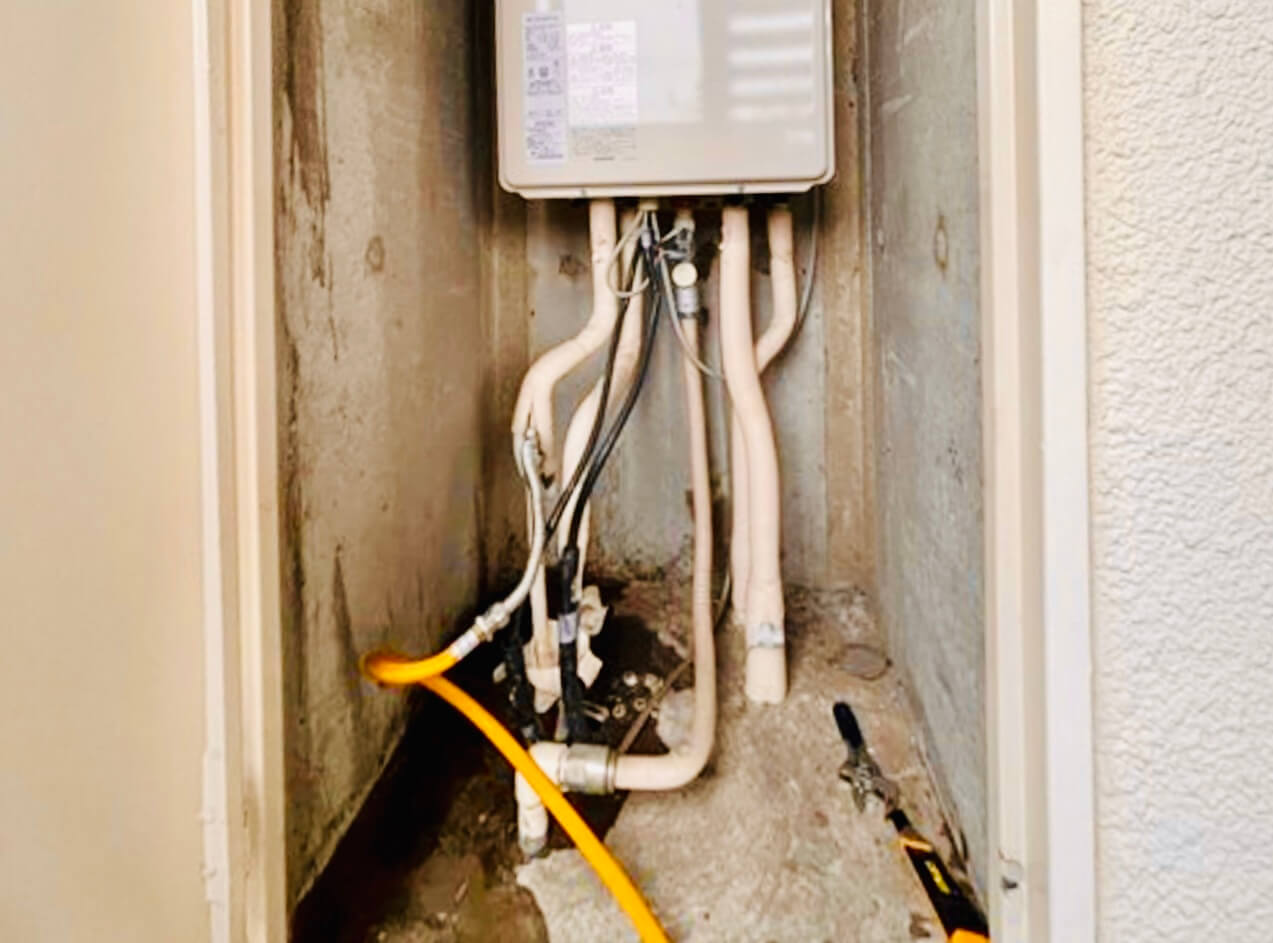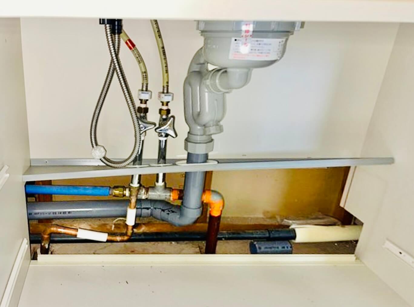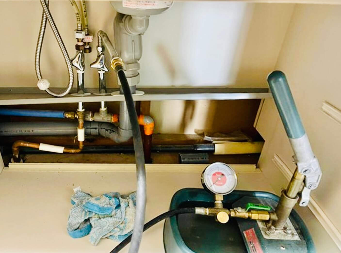 パイプスペースの給湯器から給湯管の耐圧テストを、キッチンシンク下から給水管の耐圧テストをそれぞれ行いました。