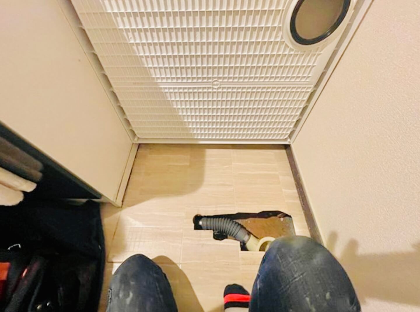 洗濯機を移動させ洗濯パンを取外して洗面所奥の床下を確認すると、洗面所裏のトイレにつながる排水管の貫通部周りが濡れていました。