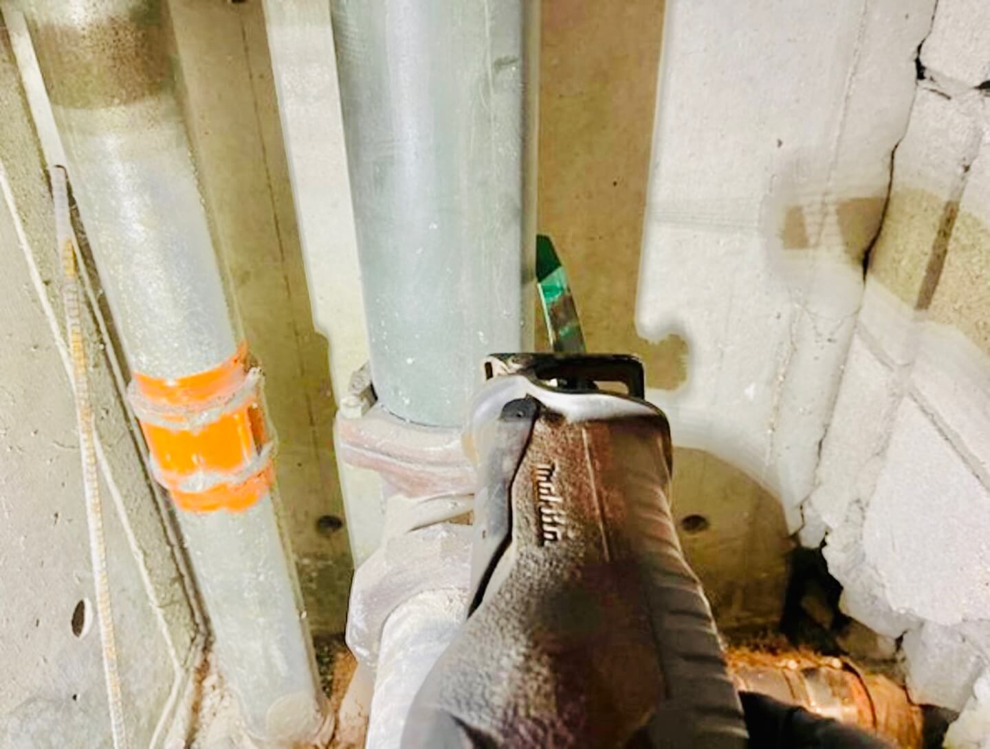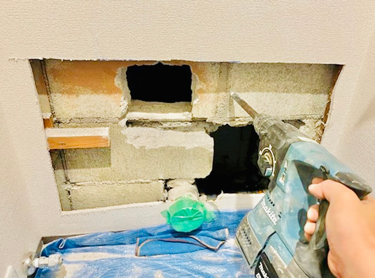 調査時開口したトイレ壁のパイプスペースから、上階から下階への配管貫通部をはつりました。