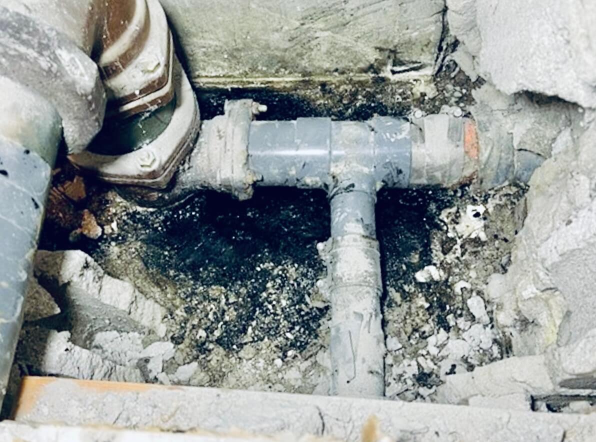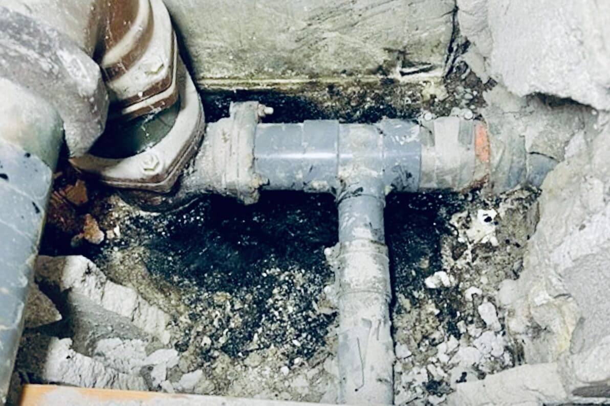 ボード後ろのブロックをはつってマンション共用部の排水スペースを見ると、排水パイプの底に水が溜っていました。