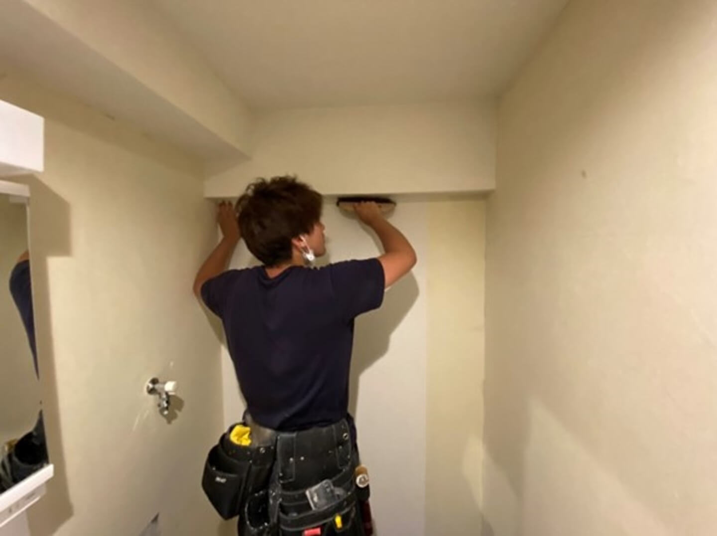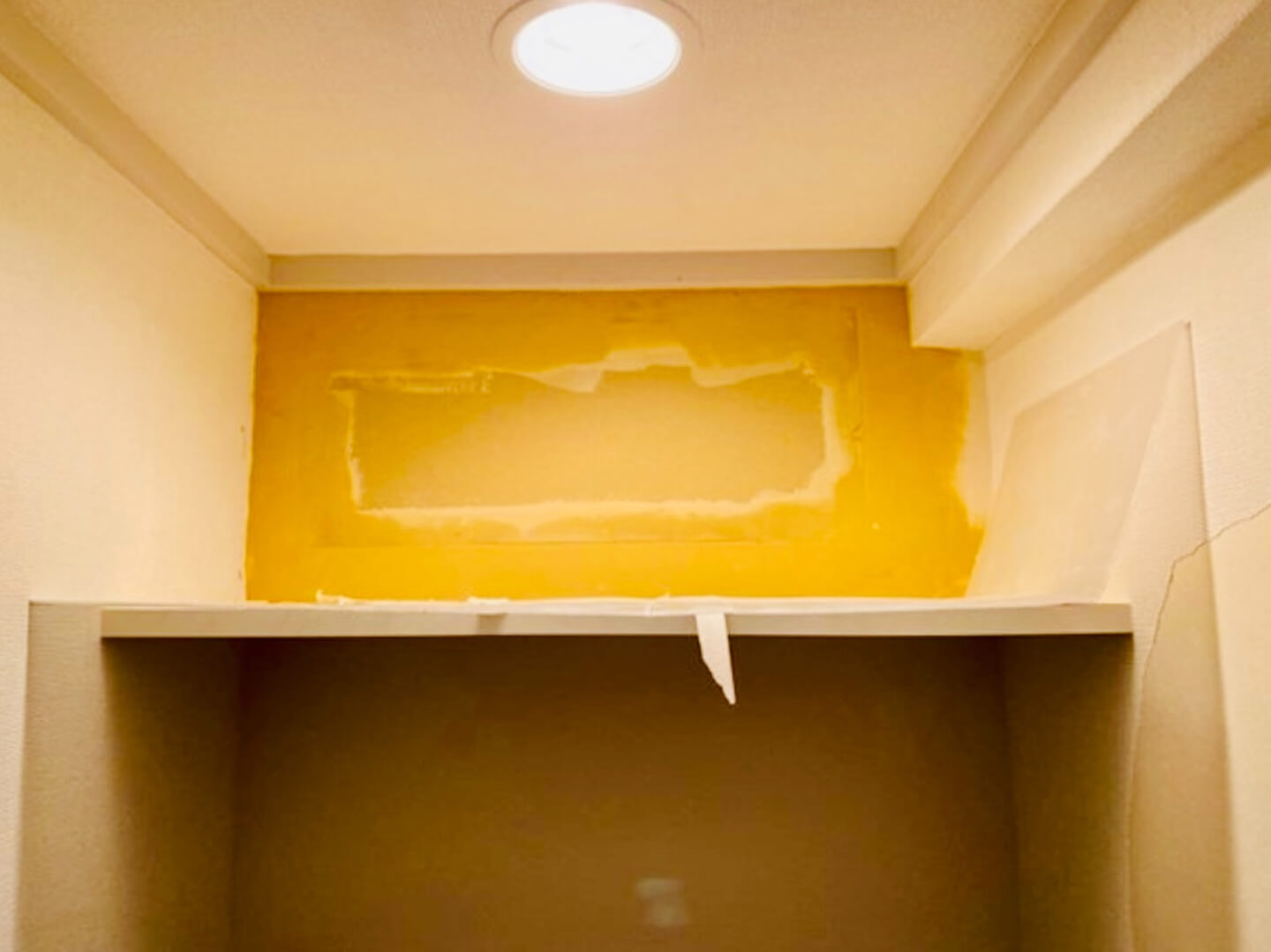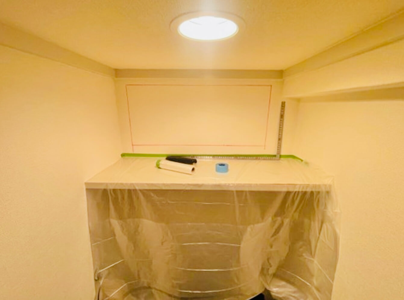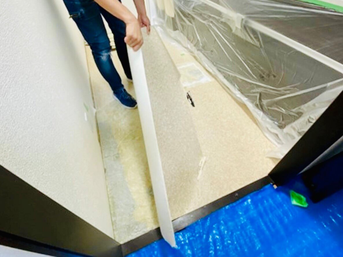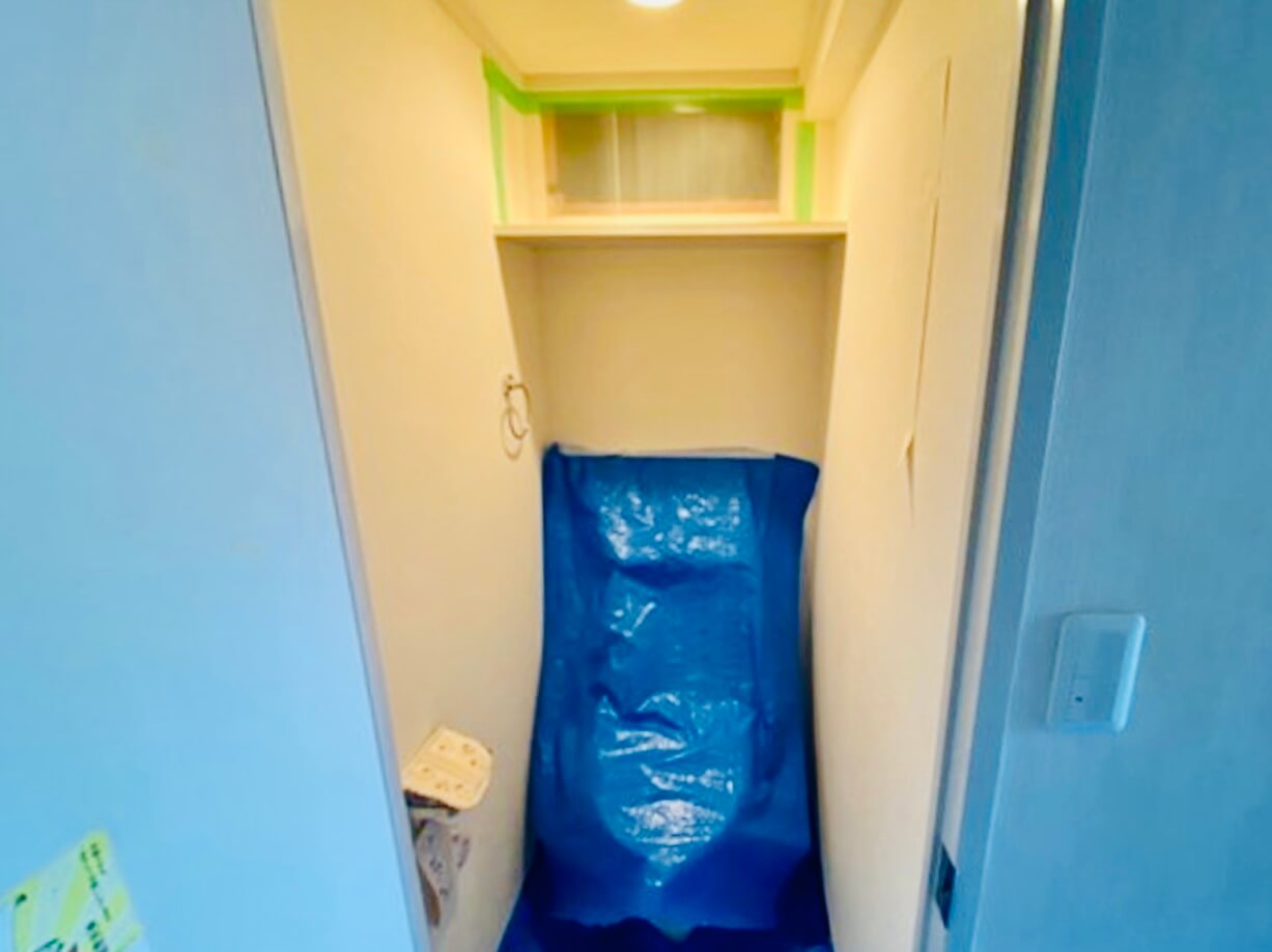 荷物の移動経路を養生して、配管改修工事のために開けたトイレ壁の復旧工事を行いました。