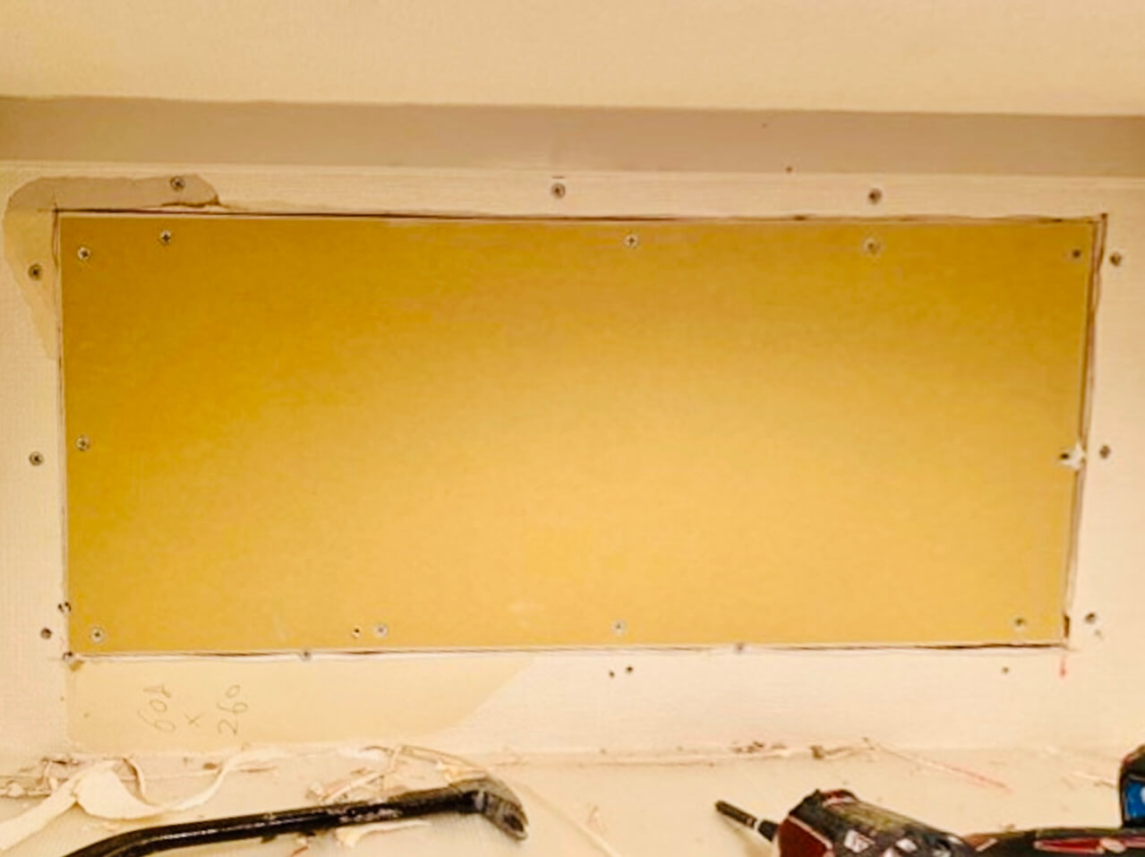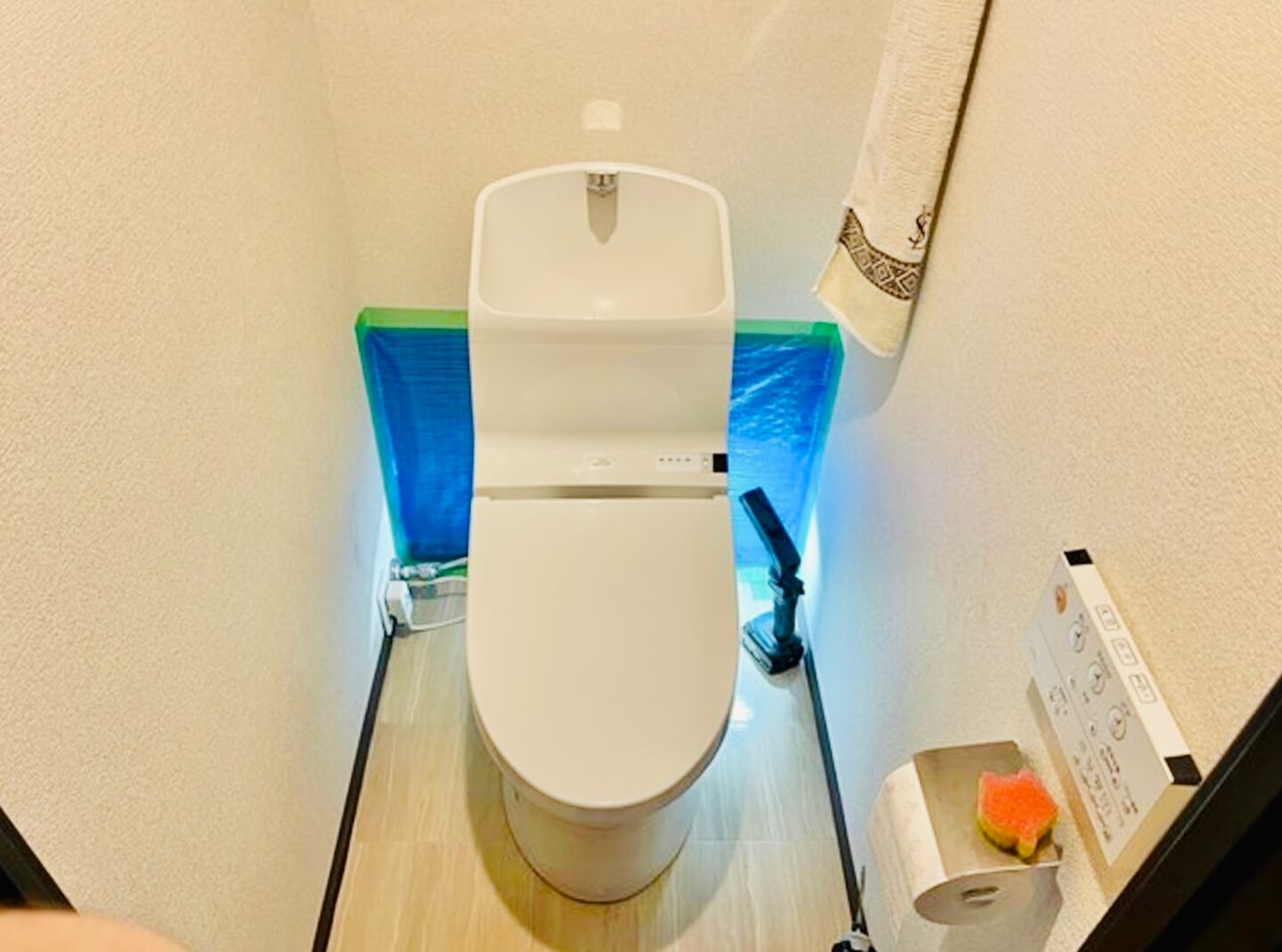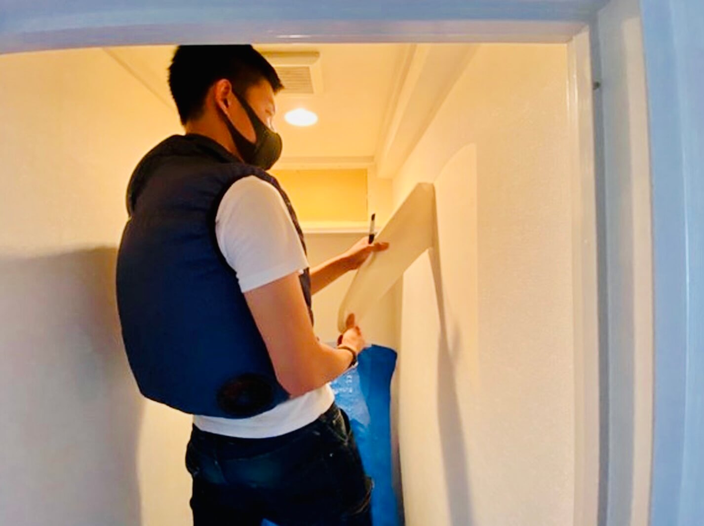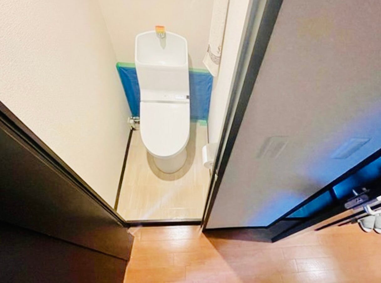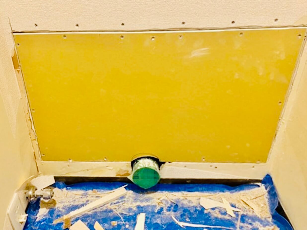 荷物の移動経路を養生して、配管改修工事のために開けたトイレ壁の復旧工事を行いました。