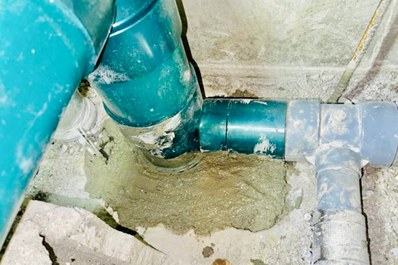 洗面所とキッチンの吐水テストで水漏れがないことを確認して、貫通部をモルタルで埋め戻しました。