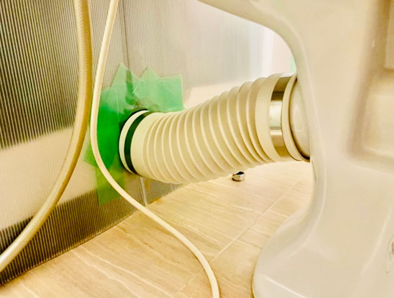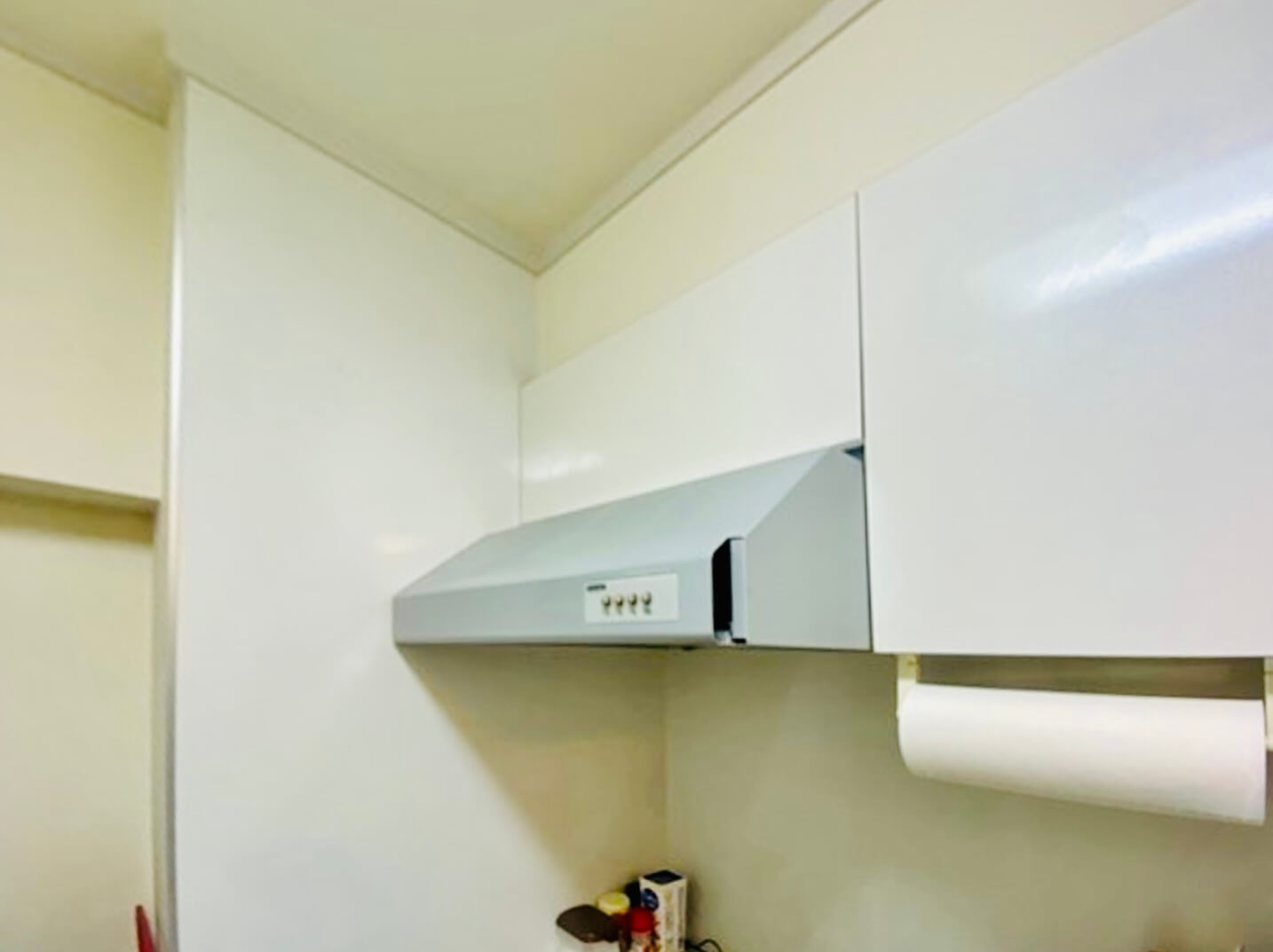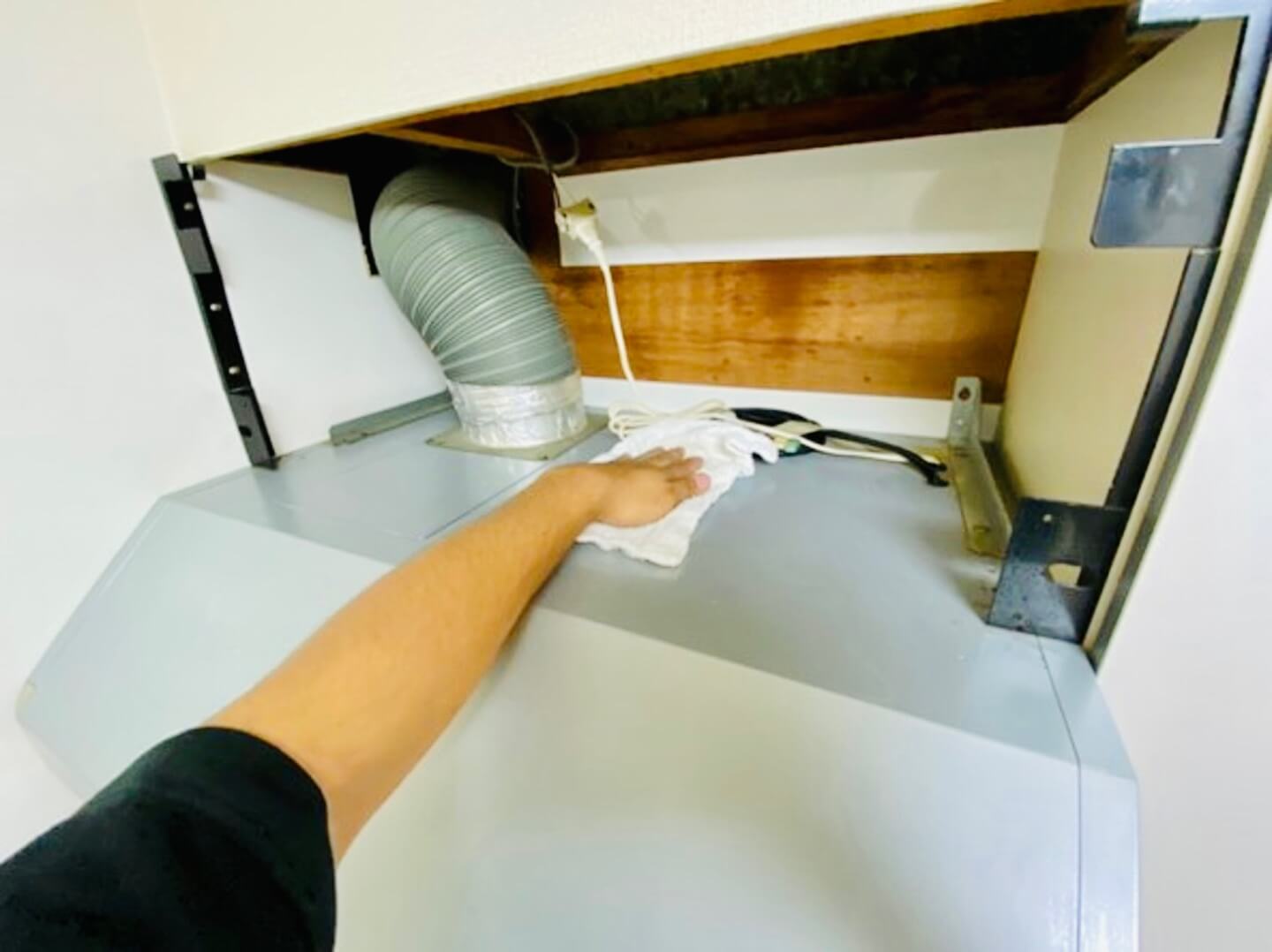 漏水被害を受けたキッチンの換気扇は、作動に異常なく、お客様から交換希望がないとのことで、アルコール消毒の防カビ処理と清掃だけを施工しました。