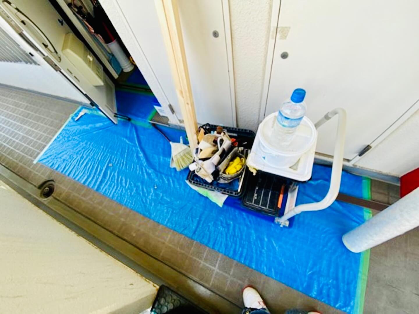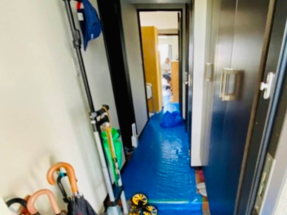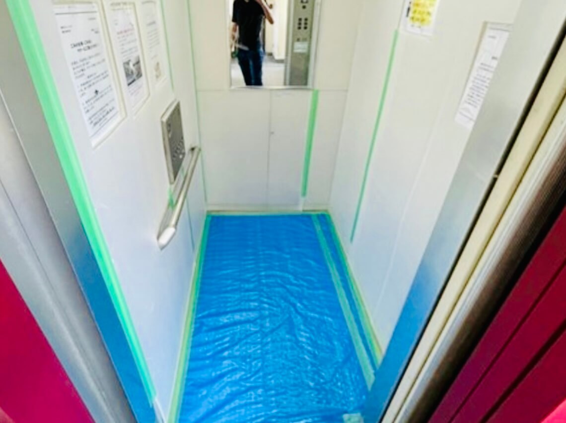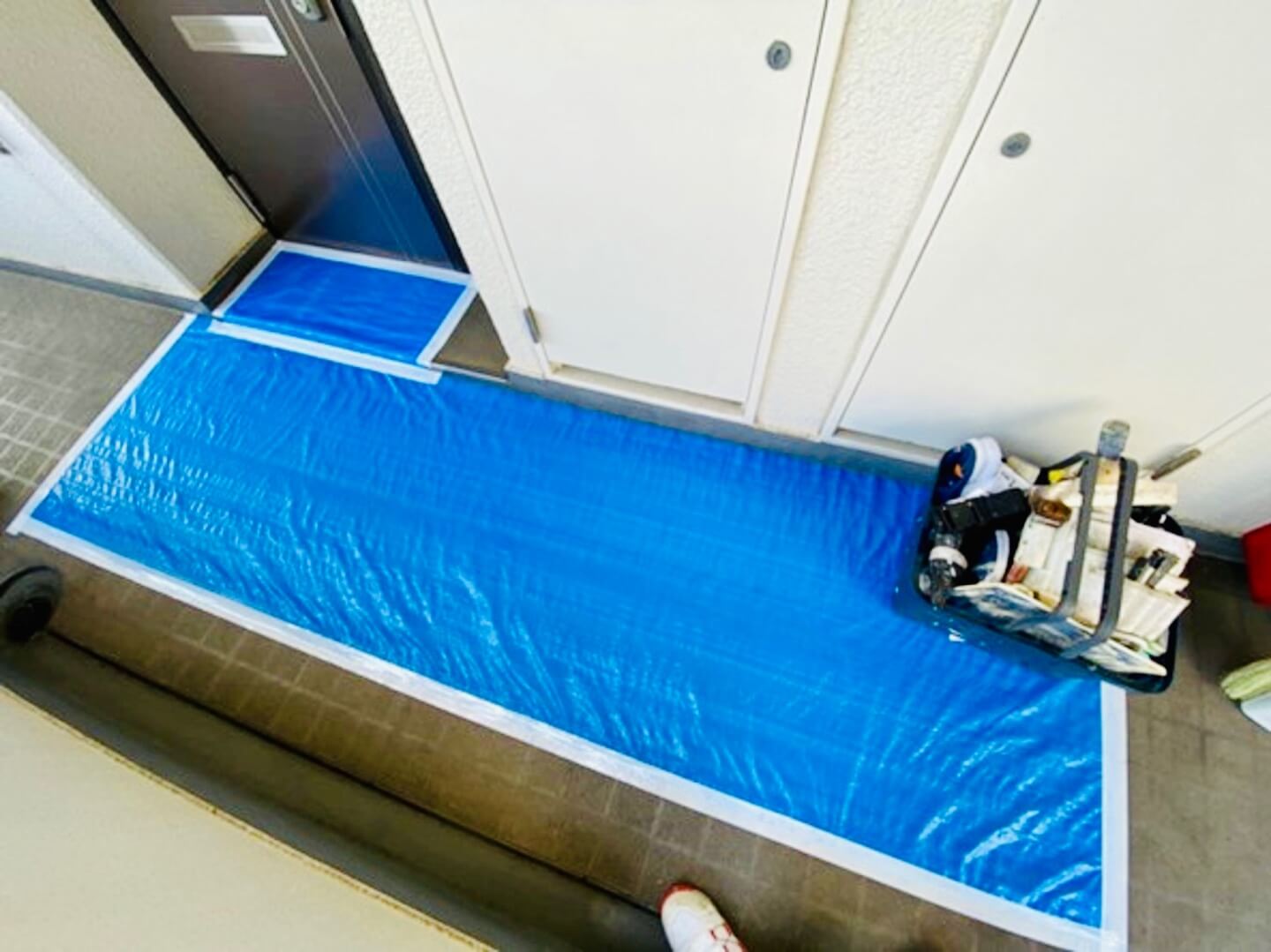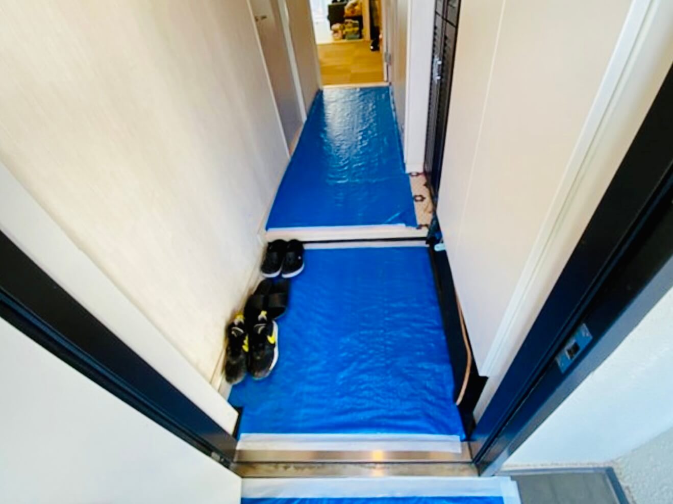 エレベーターと共用廊下、工事を行う専有部をブルーシートで養生しました。