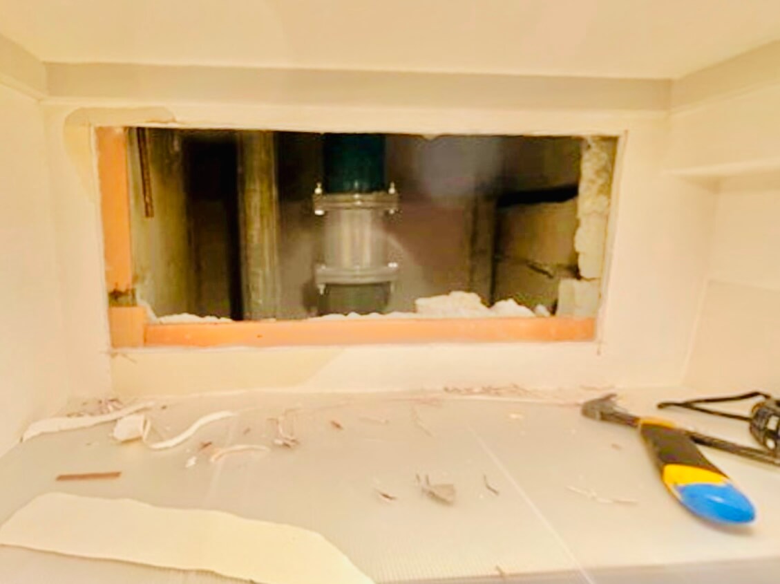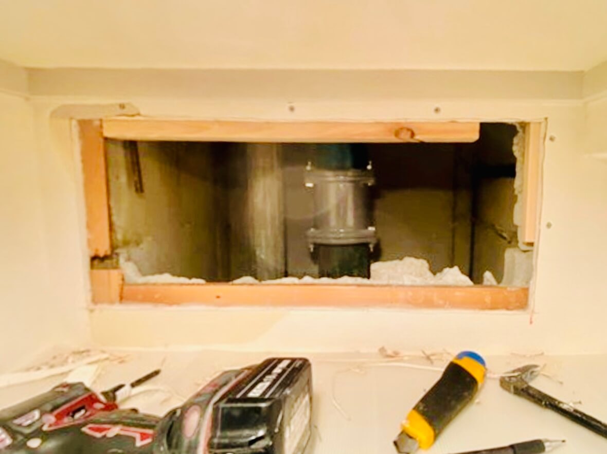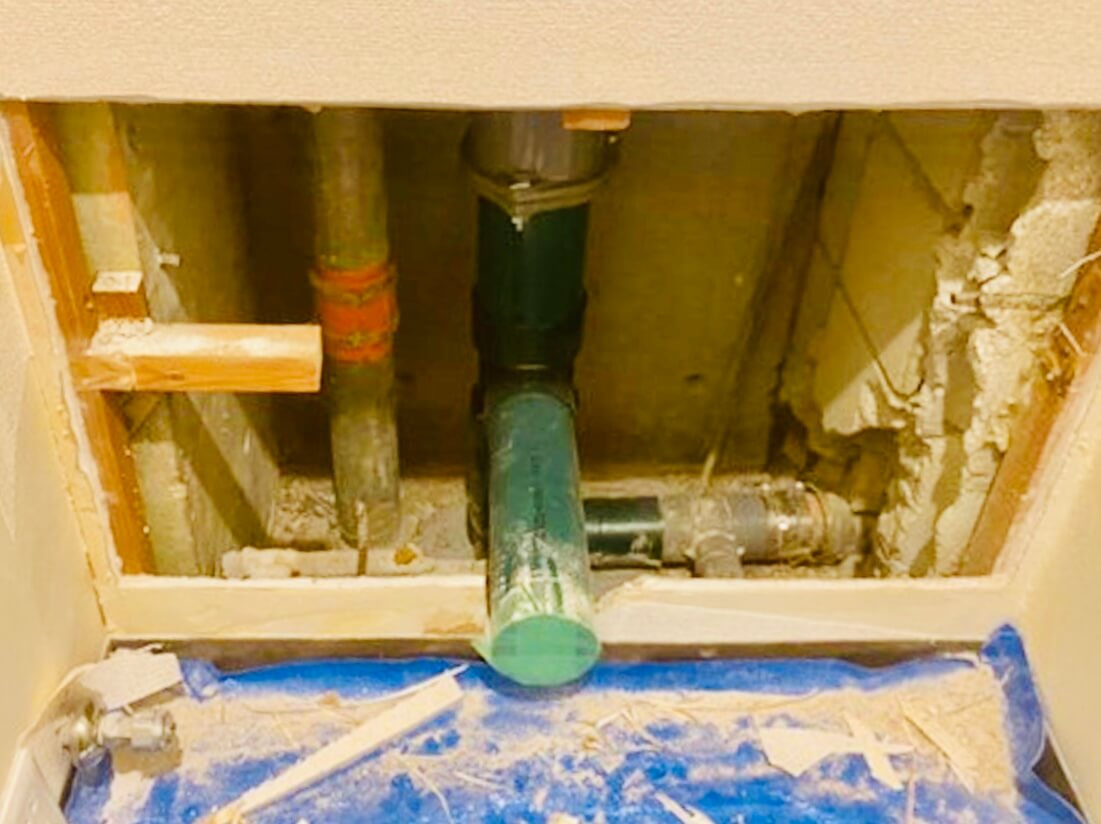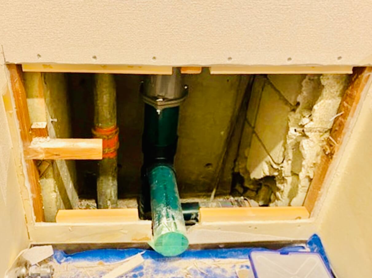 下階のトイレ壁の上部を開けて、漏水原因配管を撤去して、新規配管を施工しました。