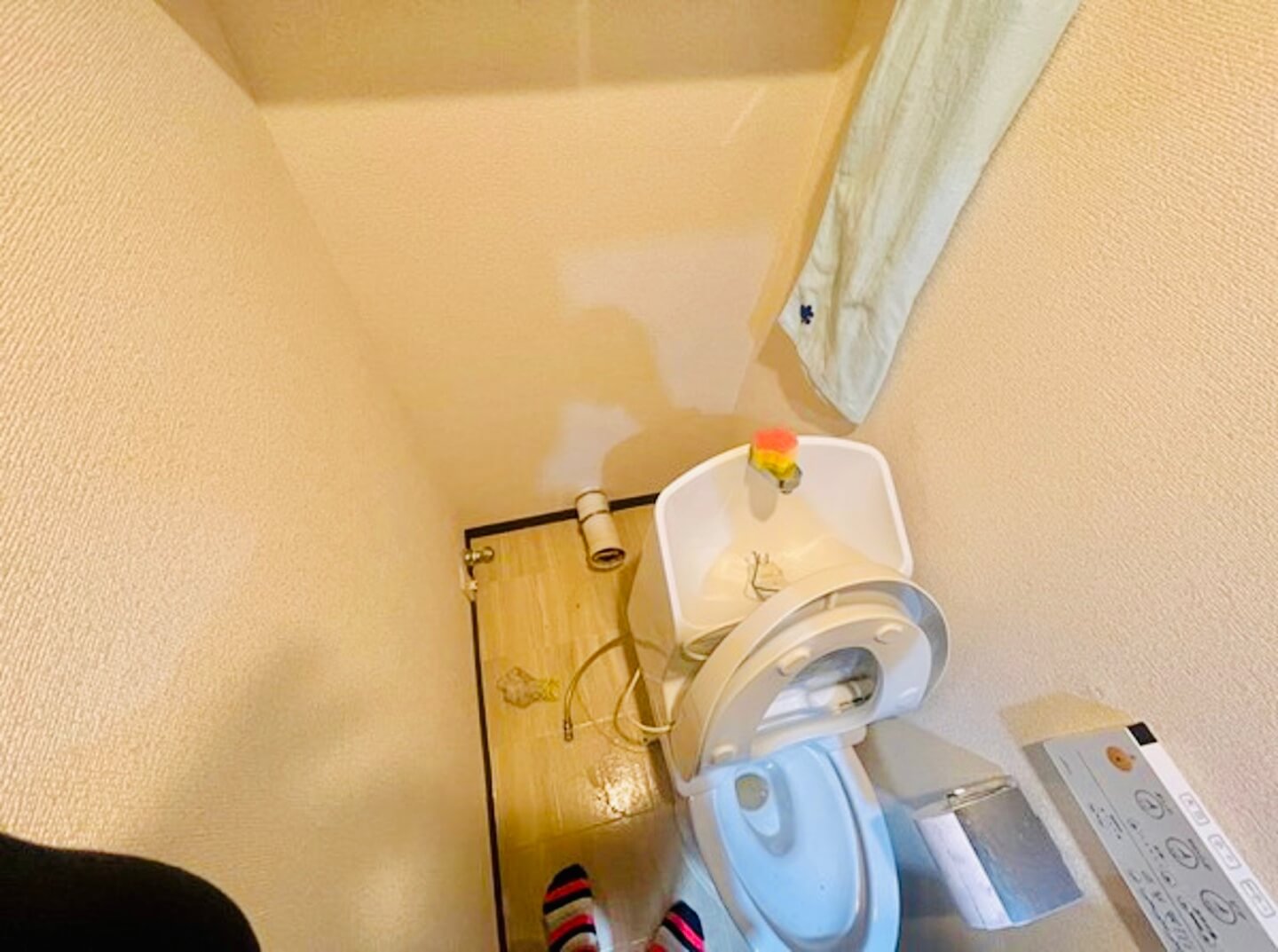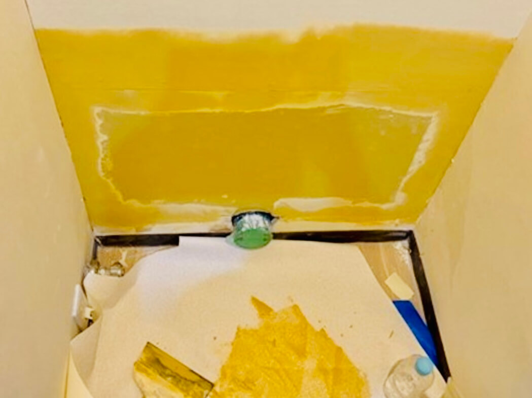 トイレの排水テストで下階に漏れがないことを確認して、上下階とも開口部を仮復旧しました。