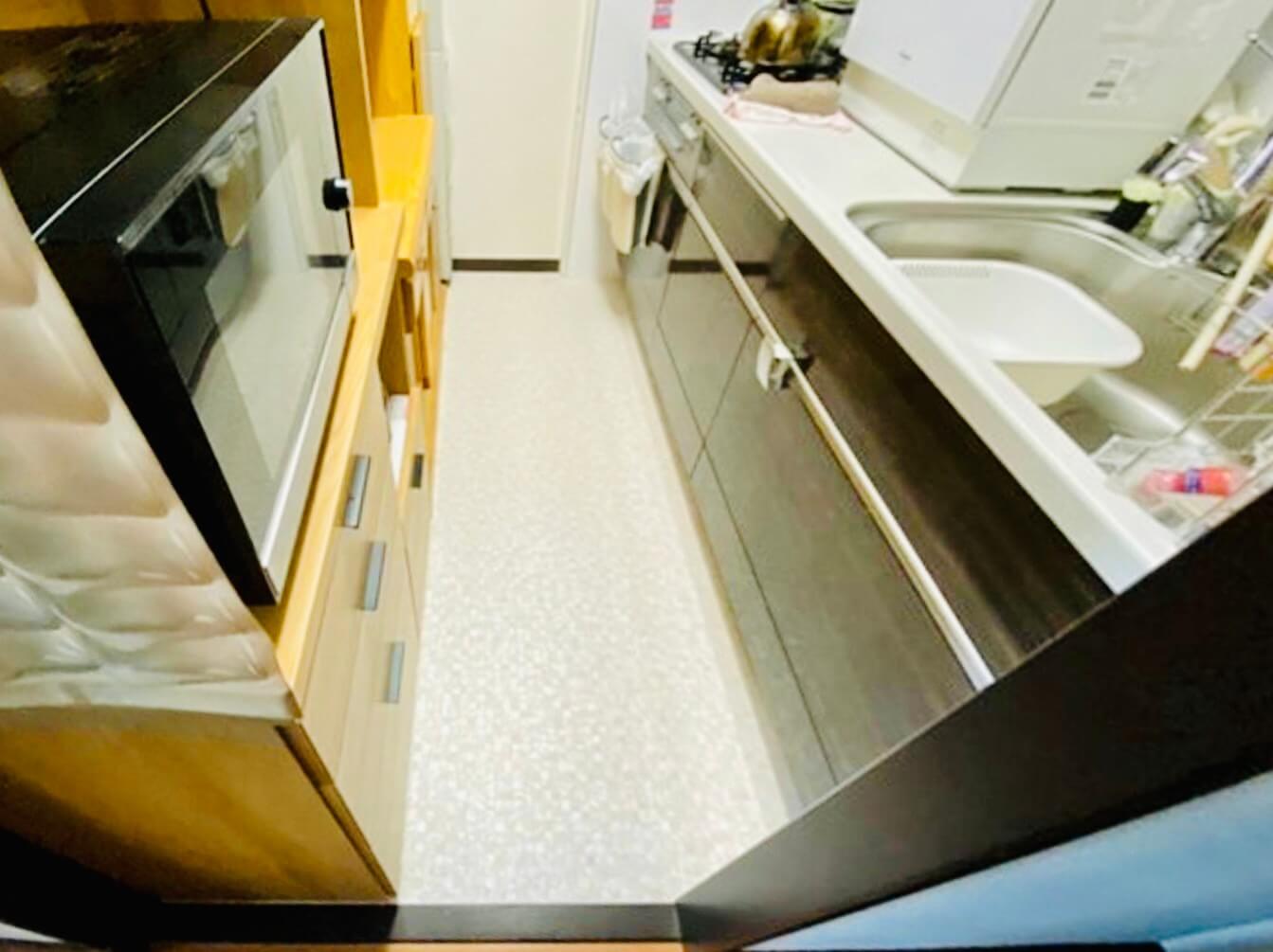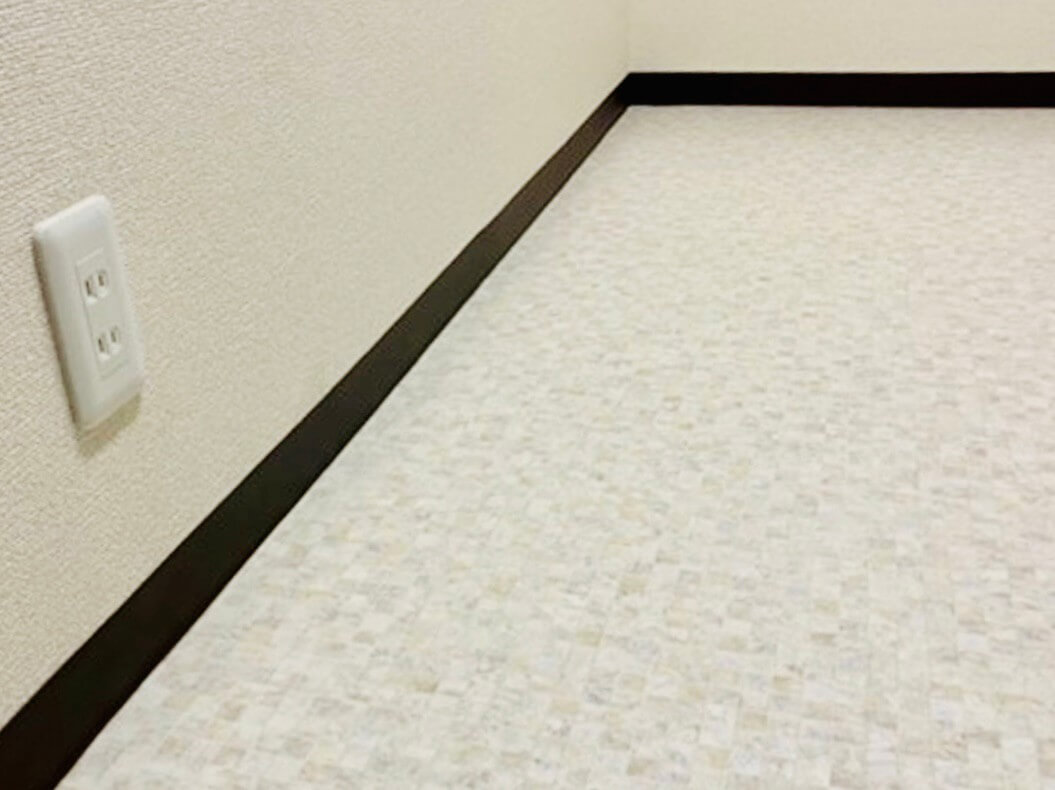 キッチンはクッションフロアを剝がして開口部にパテ処理を行い、新規クッションフロアとソフト巾木を交換しました。
