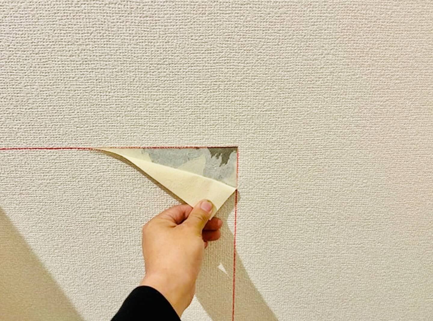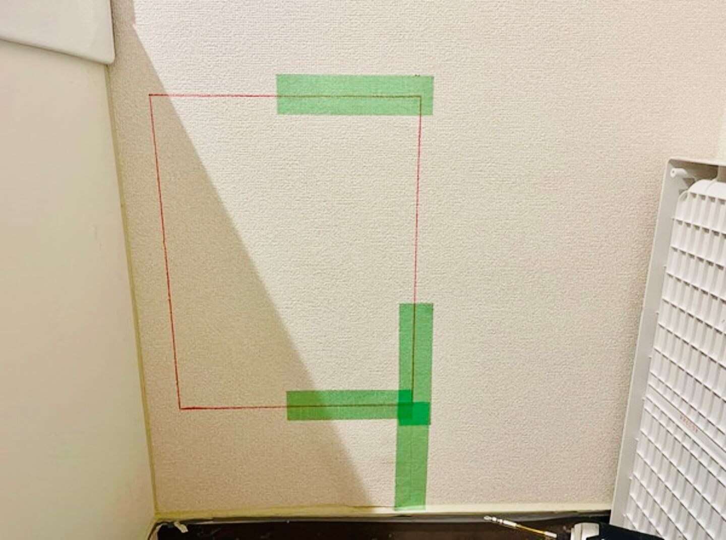 洗面所の開口部は洗濯機の裏側で、壁に開けようとした赤線が引かれていましたが、クロスを剥がすと躯体でした。