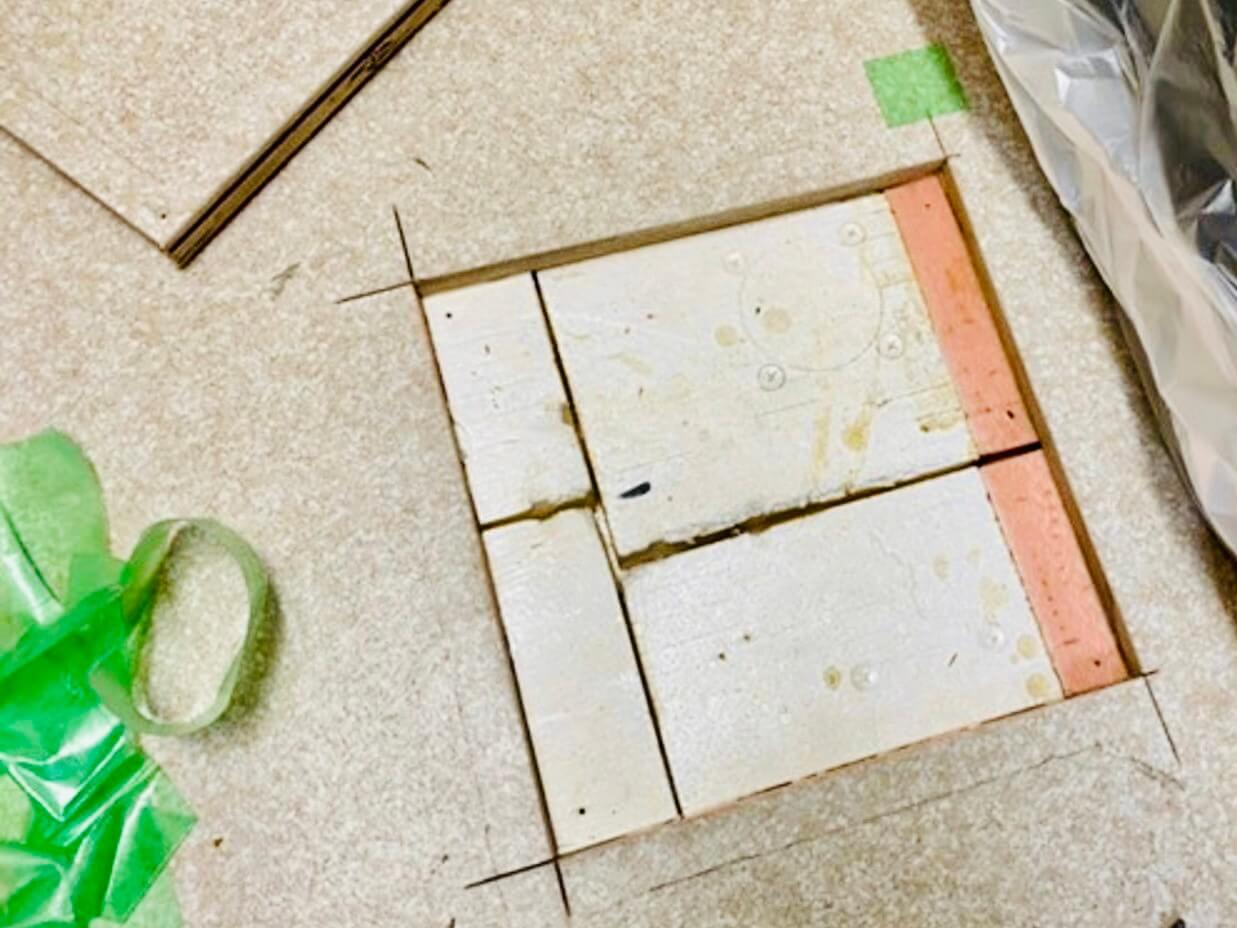 キッチンの床開口部を確認すると、スタイロフォームが敷き詰まれていて床下が確認できないようになっていました。